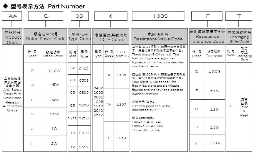風(fēng)華高科車規(guī)抗浪涌厚膜片式固定電阻器型號(hào)命名規(guī)則:
