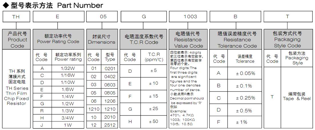 風(fēng)華高科高穩(wěn)定性薄膜片式固定電阻器 - TH 系列型號命名規(guī)則: