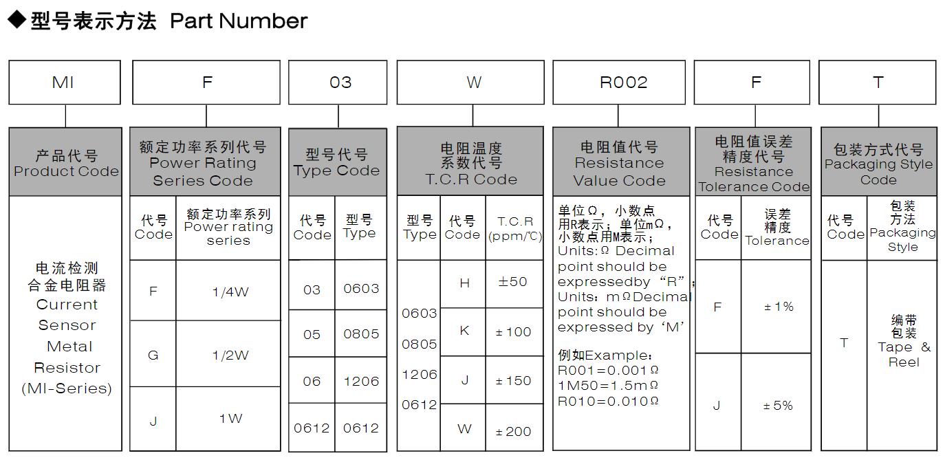 風華高科電流檢測合金電阻器(MI系列)型號命名規則: