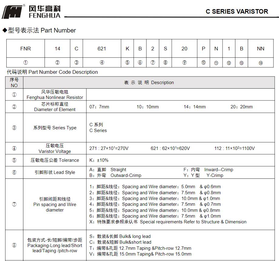 風華高科C系列壓敏電阻器型號命名規則: