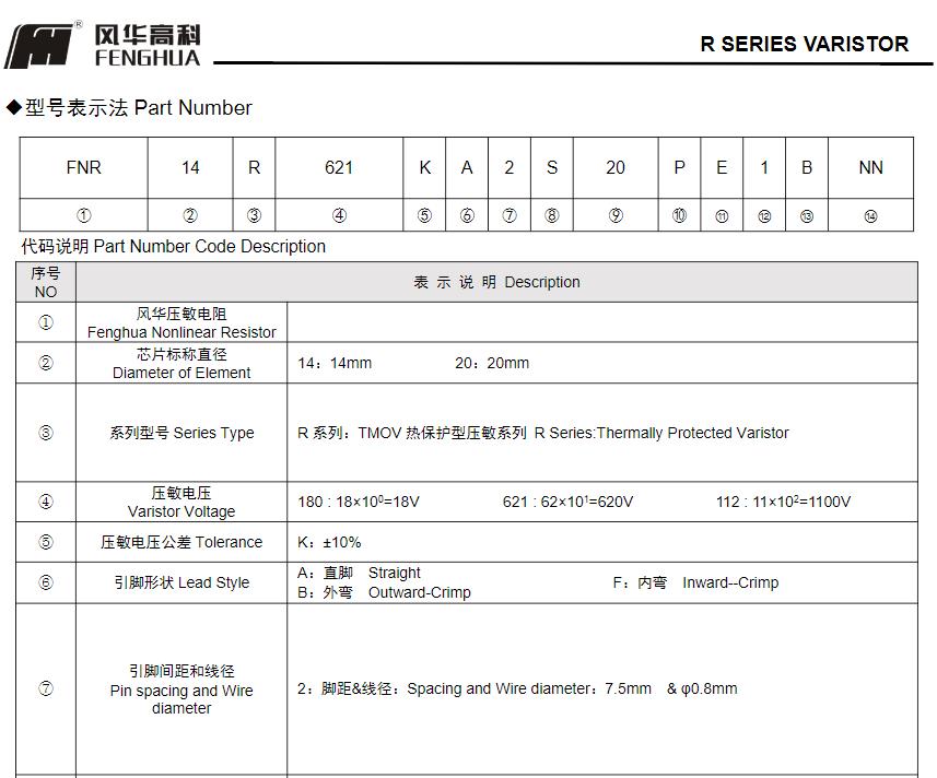 風華高科R系列壓敏電阻器型號命名規則: