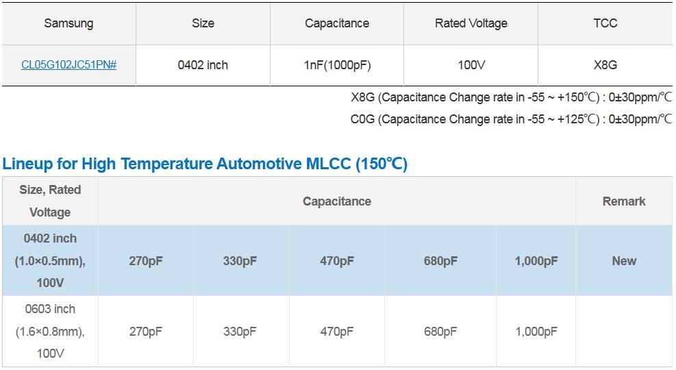 三星電機新品溫度補償用車載MLCC 150℃ 0402 1nF 100V