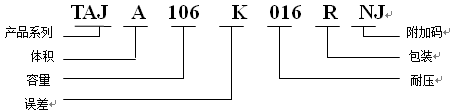 第一部分TAJ:AVX貼片鉭電容的系列號,TAJ系列鉭電容中文俗稱標準品系列,AVX鉭電容共有TAJ,TPS,TPM,TAP,TBC等系列。