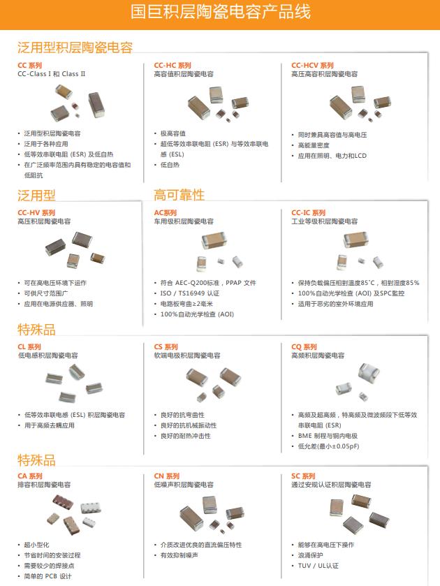 國巨的積層陶瓷電容為電路設計人員提供出色的性能、可靠性和成本優勢。國巨提供多種類型的積層陶瓷電容(MLCC),包括一般品,高容,高壓,軟端和高頻。其中,高容MLCC是電容方面的高端產品,順應電子行業朝向融合,多功能和小型化的趨勢。