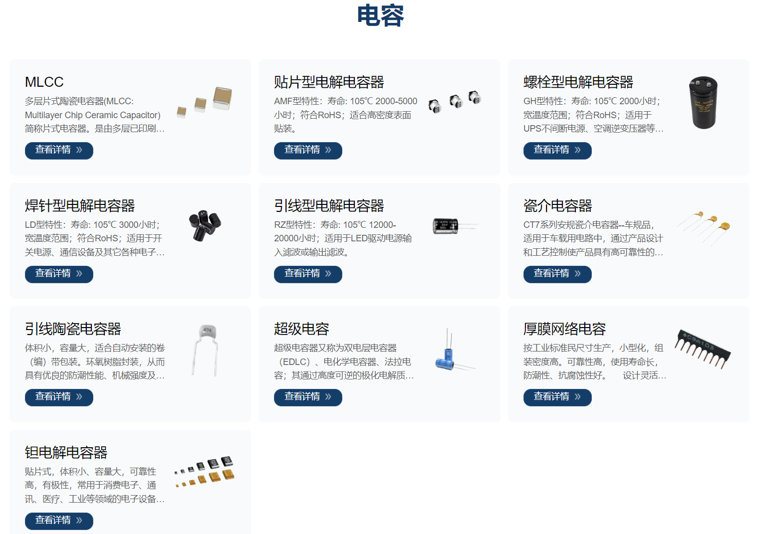 風(fēng)華電容種類有:多層片式陶瓷電容、貼片型電解電容器、引線型電解電容器、超級電容、瓷介電容器、引線陶瓷電容器、螺栓型電解電容器、焊針型電解電容器、厚膜網(wǎng)絡(luò)電容、鉭電解電容器等產(chǎn)品。