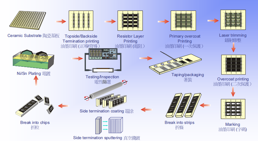 貼片電阻器電阻體材料 氧化釕類 鎳鉻合金 電阻體厚度 >10um <1um 關(guān)鍵工藝 絲網(wǎng)印刷