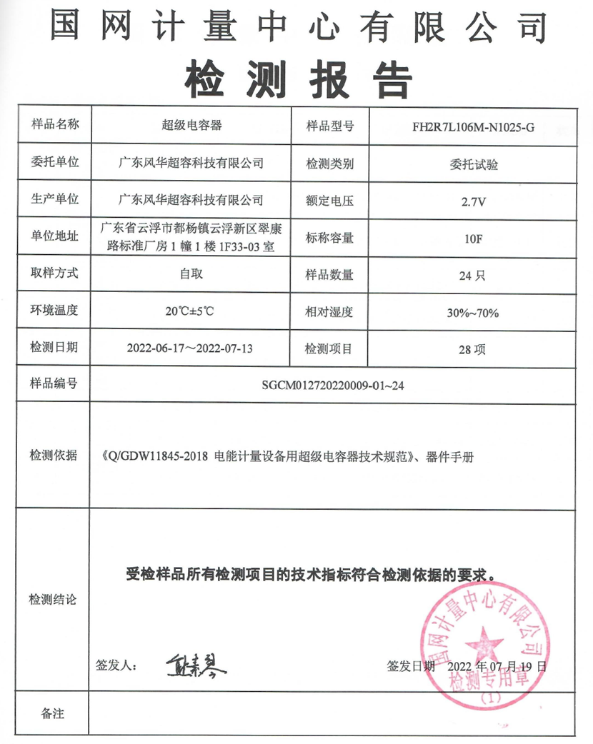 7月下旬,風華高科超級電容器產品在國網計量中心順利通過測試認證,該認證表明風華高科超容產品完全符合國家電網智能電表的嚴格要求。