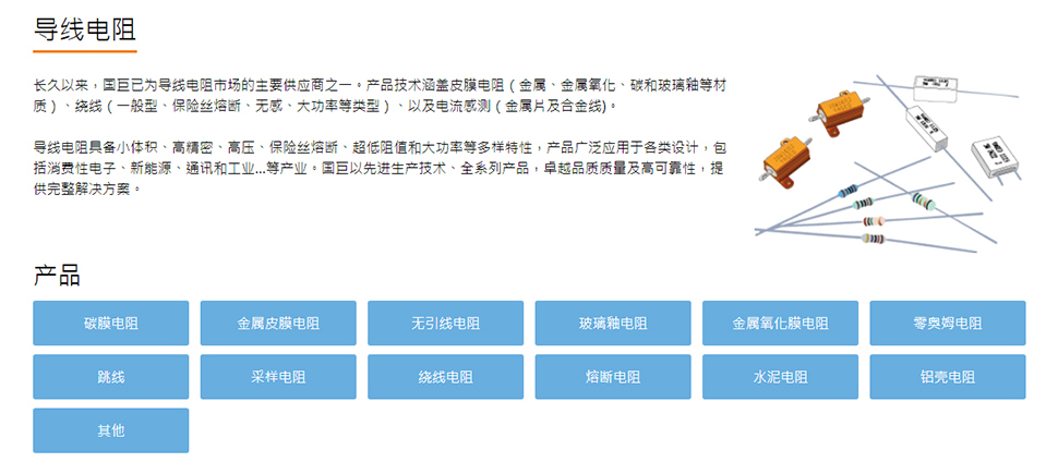 作為提供「一次購足服務」的大型被動組件供貨商,國巨提供完整的產品線,包括芯片電阻、積層陶瓷電容、導線電阻、無線組件、鋁質電解電容和電感。國巨的多元化產品皆針對主要的垂直市場研發,包括手機、平板計算機、網絡、家電、工業/電力、再生能源、醫療和汽車應用。