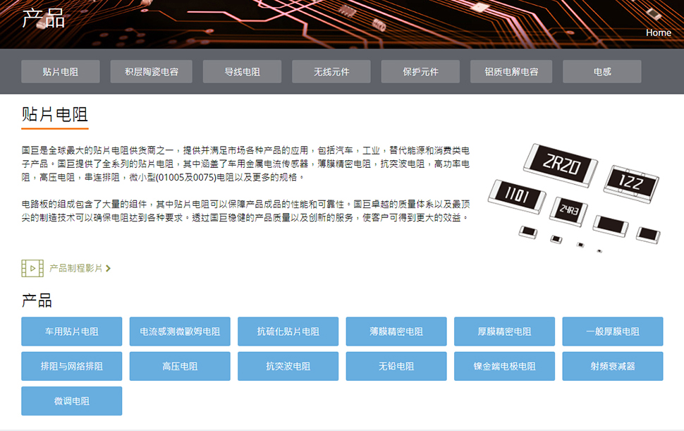 國巨公司成立于1977年,為全球領先的被動元件服務供應商,其生產及銷售據點涵蓋亞洲、歐洲及美洲。國巨公司獨特優勢為提供客戶「一站式服務」,供應完整的電阻、電容及電感等被動元件,以滿足客戶各種不同領域應用的需求。